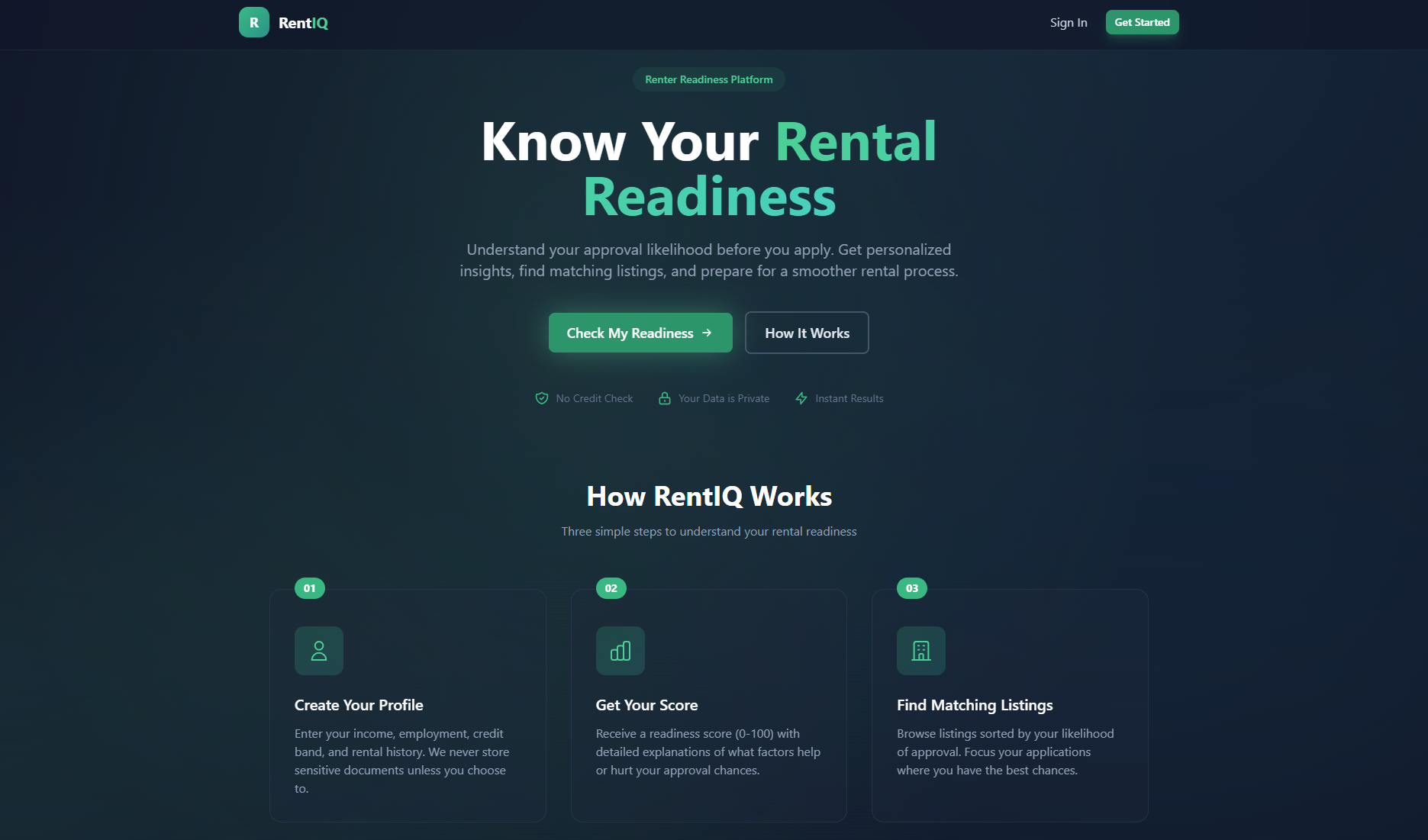 RentIQ helps renters understand their approval readiness by turning income, credit ranges, and rental history into a clear, transparent view of how competitive they are for a listing.